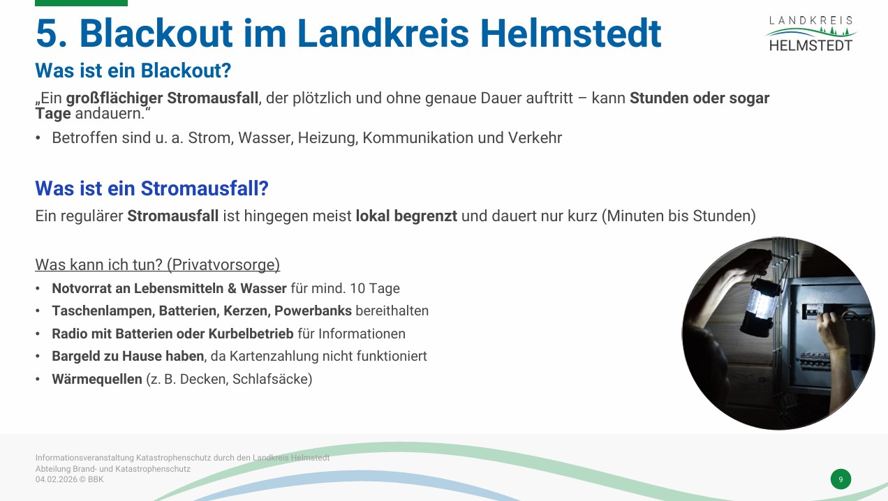 Die Veranstaltung beschäftigte sich mit den Themen Stromausfall, Katastrophen und Blackout. Dabei wurde erklärt, wie der Landkreis auf solche Notfälle vorbereitet ist und welche Maßnahmen im Ernstfall greifen.